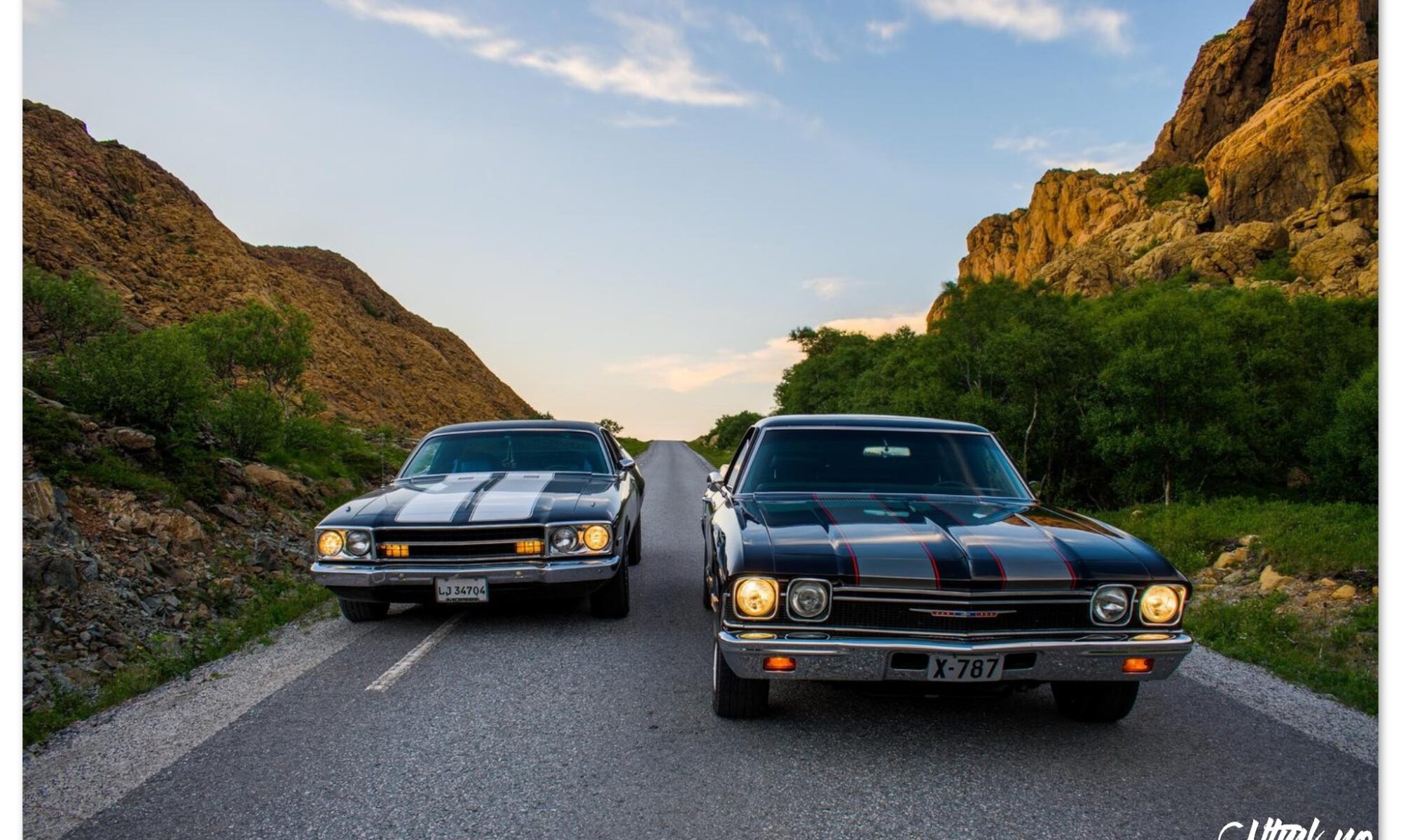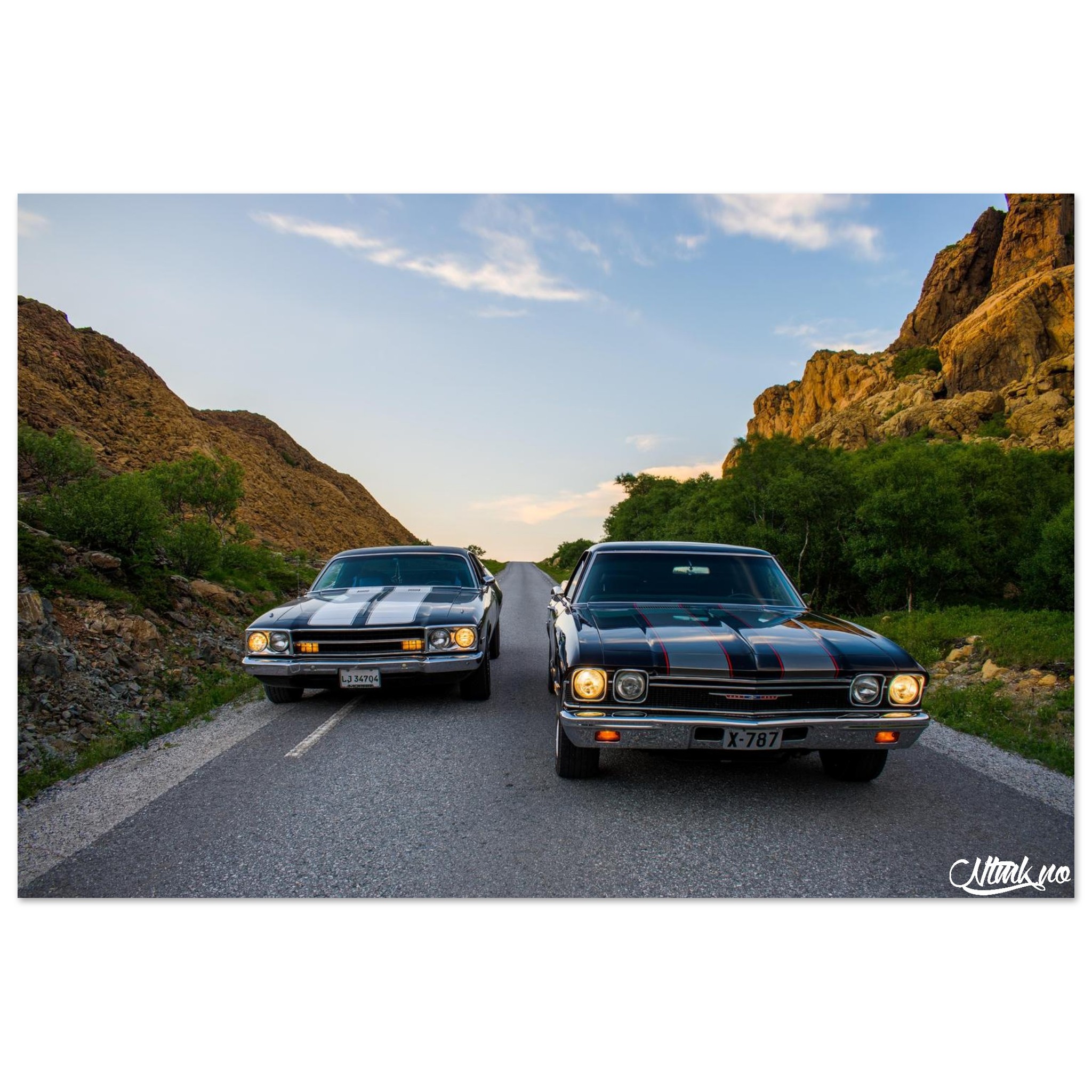 Plakat på 60 x 90 cm / 24 x 36″ med bilde av 1968 Chevrolet El Camino og 1973 Plymouth Satellite, tatt på Leka i Ytre Namdal.