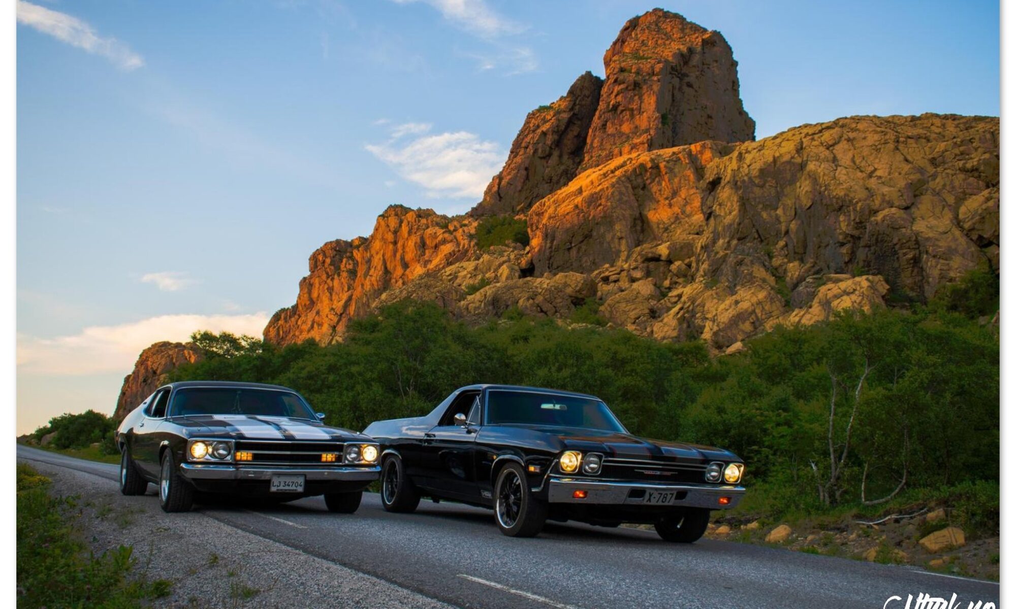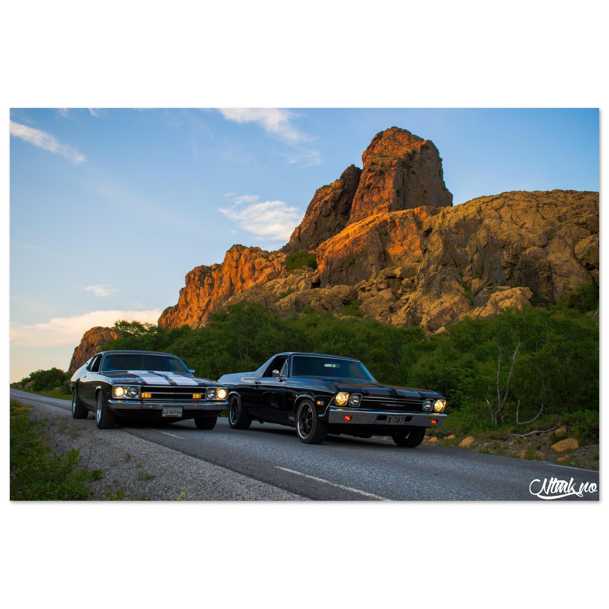 Plakat på 60 x 90 cm / 24 x 36″ med bilde av 1968 Chevrolet El Camino og 1973 Plymouth Satellite, tatt på Leka i Ytre Namdal.